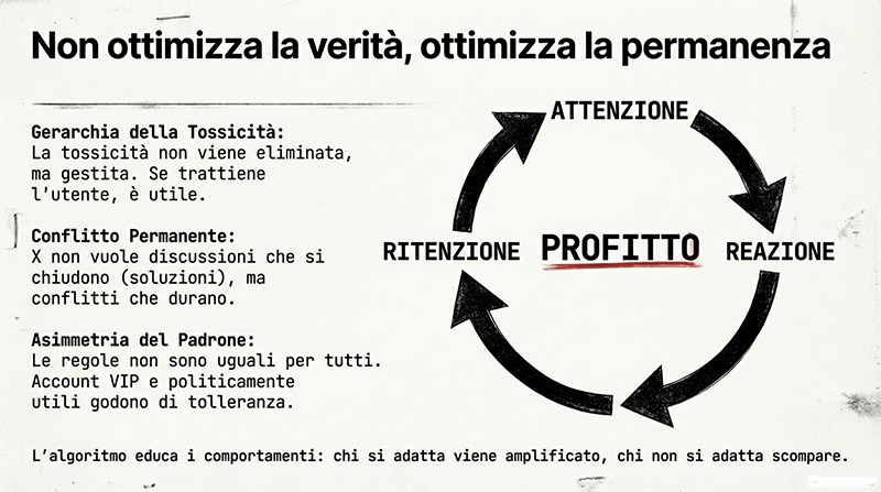 La tossicità non è un bug da espungere, ma una risorsa da gestire. X la modula, la distribuisce, la usa fintanto ché non viola le sue stesse regole. La tossicità genera thread lunghi, crea fazioni, fidelizza identità antagoniste. Viene penalizzata solo quando diventa ingestibile.