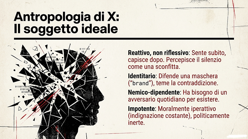 Un soggetto a cui tende l’algoritmo di X è il soggetto moralmente iperattivo e politicamente impotente. Su X giudicare è facile, ma agire è raro. Il sistema incentiva l’indignazione costante, ma scoraggia l’organizzazione e la costruzione lenta. Il soggetto che cerca di costruire qualcosa è punito.