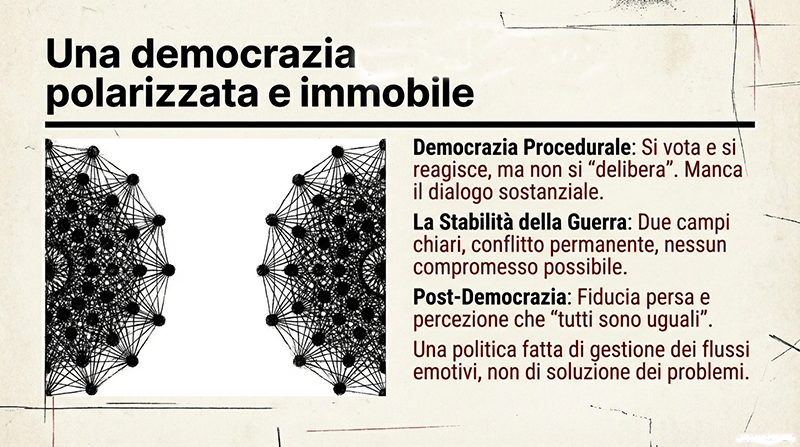 Ma è importante tenere a mente che l’algoritmo non produce una democrazia caotica, bensì una democrazia stabile, perché rigidamente polarizzata. Una democrazia che ha due o più campi con confini chiari, identità forti e un conflitto permanente. Una democrazia instabile nel discorso, inadatta al dialogo, ma stabile nella struttura.