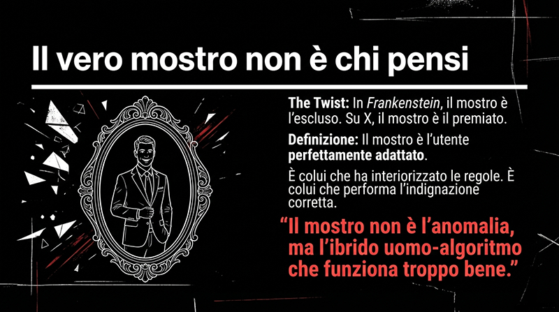 In Frankenstein il mostro è creato dalla società, viene rifiutato, e, dopo l’esclusione, diventa violento. Su X, invece, il mostro viene premiato, non escluso, non è l’anomalia, ma il comportamento meglio adattato. Il mostro oggi non è chi trasgredisce le regole, ma chi le interiorizza perfettamente, chi ottimizza il linguaggio, massima l’attenzione e performa l’indignazione. È umano, riconoscibile, plausibile, ed è questo che fa paura.