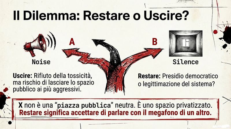 Il punto essenziale, da non perdere mai di vista, è che X non è più lo spazio pubblico classico. Non è neutro, non è comune, non è democratico. È uno spazio pubblico privatizzato con regole opache, e asimmetrie strutturali. Questo è lo spazio che presidiamo se restiamo.