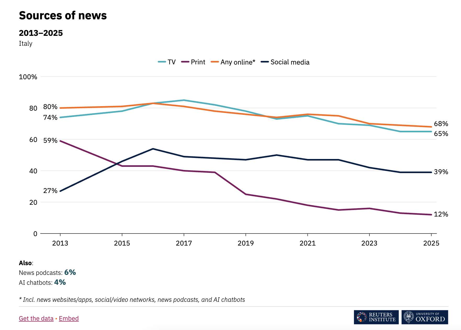 Un panorama più preoccupante è dipinto invece dal Reuters Institute for the Study of Journalism dell’Università di Oxford, che ogni anno redige il Digital News Report 2025. L’indagine, effettuata su un campione di 17 paesi, mostra che i giovani sono sempre meno interessati alle notizie, e questo mette a rischio la loro partecipazione democratica. Tra il 2015 e il 2024, la percentuale di persone che leggono news online settimanalmente è diminuita di 13 punti percentuali nella fascia 18-24 anni, rispetto a un calo di soli 5 punti tra gli over 55. Guardando solo all’Italia, il trend è ancora più accentuato: la carta stampata, che veniva letta dal 59% dei rispondenti nel 2013, oggi arriva a malapena al 12%. Parallelamente, i social media sono passati dal 27% al 39%.