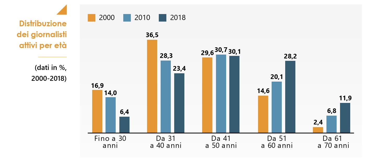 Circa il 12% dei giornalisti attivi ha più di 60 anni, mentre la stessa quota era pari solo al 2% nel 2000, anno in cui più della metà dei giornalisti (53%) aveva meno di 40 anni (oggi sono solo il 30%). In sostanza, in poco più di 15 anni, il giornalismo italiano è passato dall’essere una professione sostanzialmente giovane, in cui oltre la metà dei giornalisti aveva meno di quarant’anni, a un’attività svolta da professionisti più maturi, in cui due quinti (40%) ha più di cinquant’anni e più di due terzi (70%) ha più di quarant’anni.