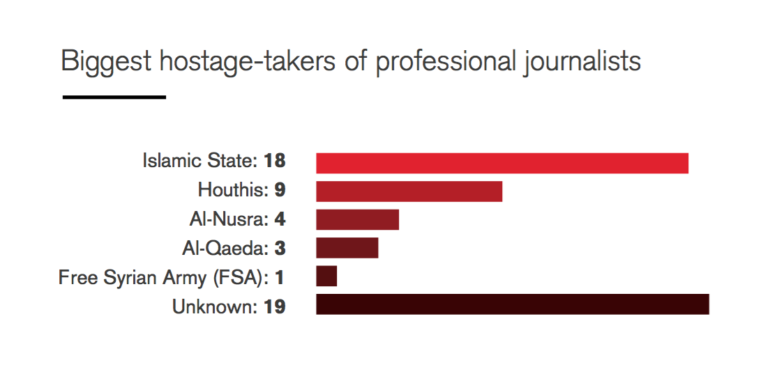 Il risultato è che intere aree geografiche – come i territori controllati del Califfato – diventano prive di copertura giornalistica. Meglio: “buchi neri dell’informazione”. Ma anche che «in alcune zone di conflitto», dichiara il segretario generale dell'organizzazione, Cristophe Deloire, «si è sviluppata una vera e propria industria degli ostaggi».
