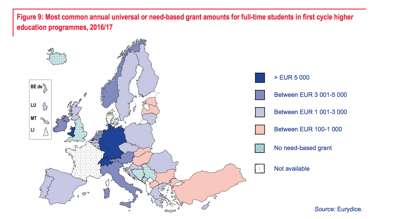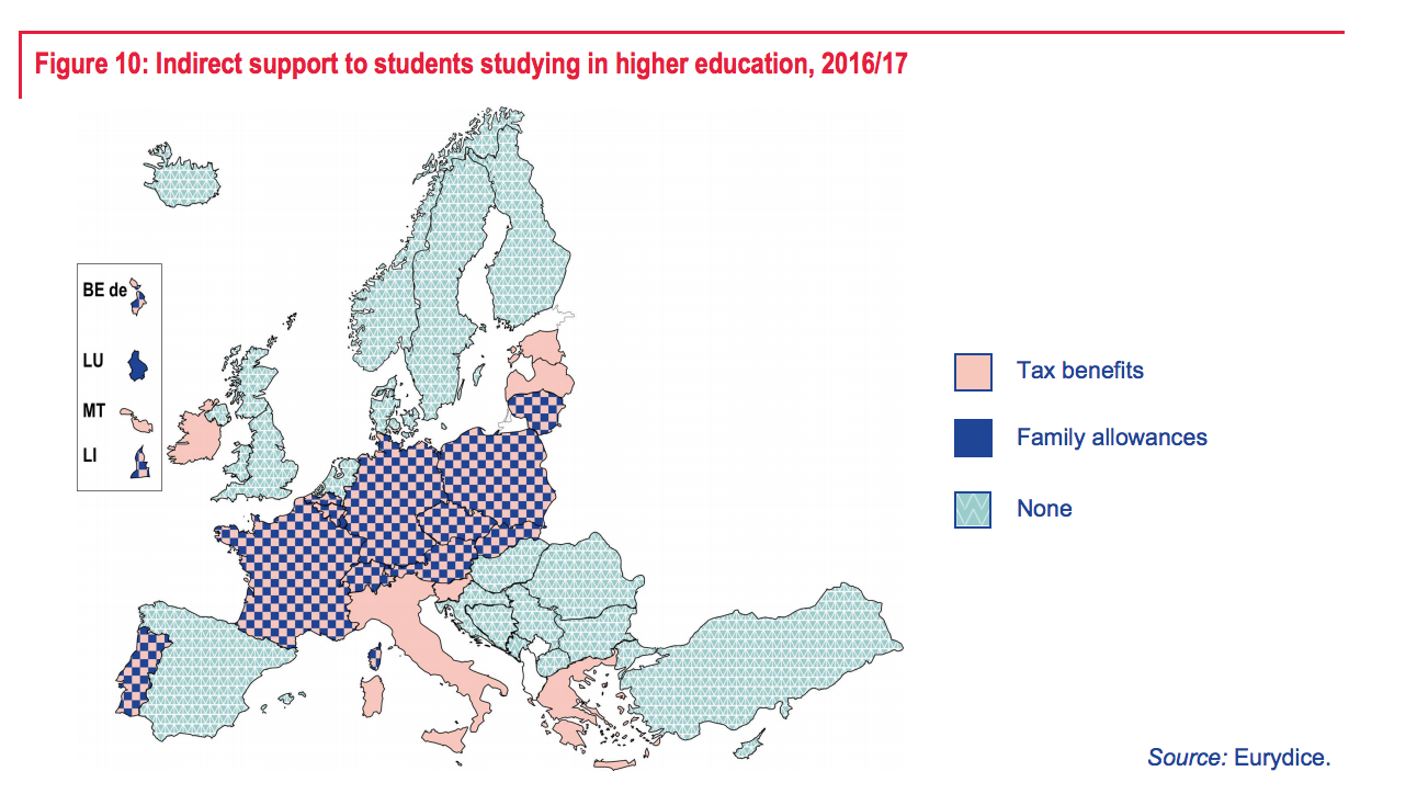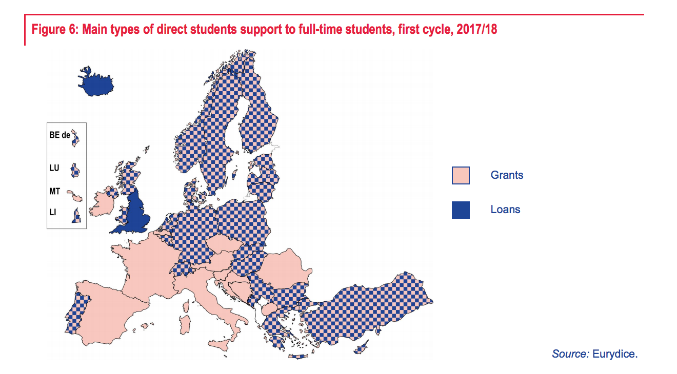 Gli Stati presi in considerazione da Eurydice differiscono significativamente per livello di spesa pubblica destinata all’università, per tipologia di contributi richiesti alle famiglie e agli studenti e interventi per sostenere gli studi. Ci sono diverse combinazioni di tasse e sussidi, sotto forma di borse di studio e prestiti. Il Regno Unito (Inghilterra, Galles e Irlanda del Nord), ad esempio, non prevede borse ma prestiti per affrontare il percorso universitario che gli studenti dovranno cominciare a restituire una volta ottenuto un lavoro. Tutti e 42 i sistemi prevedono almeno un meccanismo di sostegno diretto e metà di essi combinano supporti indiretti (agevolazioni alle famiglie e prestiti).