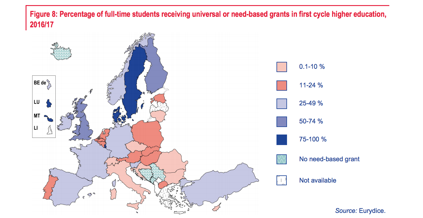 In Danimarca, Svezia, Finlandia e Scozia (che prevedono, come detto, forme di sostegno universali) oltre due terzi degli studenti riceve sovvenzioni. Al contrario, in Bulgaria, Repubblica Ceca, Croazia, Italia, Cipro, Lituania, Romania e Svizzera (che prevedono contributi basati sulle condizioni economiche o su un sistema misto che premia risultati universitari e cerca di sostenere il bisogno economico), gli studenti che beneficiano di borse di studio sono meno del 10% del totale degli iscritti.