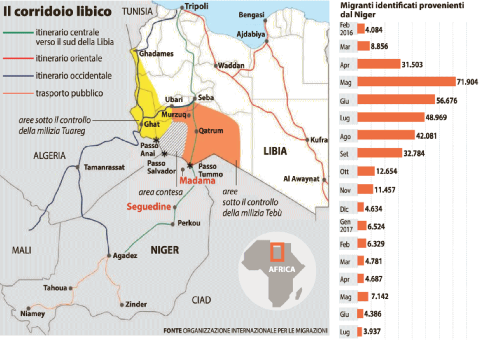 A gestire i traffici lungo la rotta è la mafia di nigeriani e sudanesi. I libici, conclude la giornalista esperta di Libia, «tendenzialmente sono sul libro paga dei trafficanti della Nigeria, del Sudan e dall’Etiopia, e gli stessi migranti pagano a questi soggetti il prezzo del viaggio e non ai “cavalli pazzi” libici».