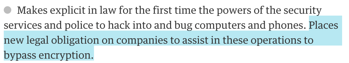 O il detestabile Investigatory Powers Bill appena presentato da Theresa May, e che i Tories vorrebbero far passare in fretta e furia in Parlamento approfittando dell'ondata emotiva delle stragi, oppure il caos. E cosa c'è in quella norma se non l'obbligo per le compagnie tecnologiche di cooperare al punto di rendere la crittografia insignificante?