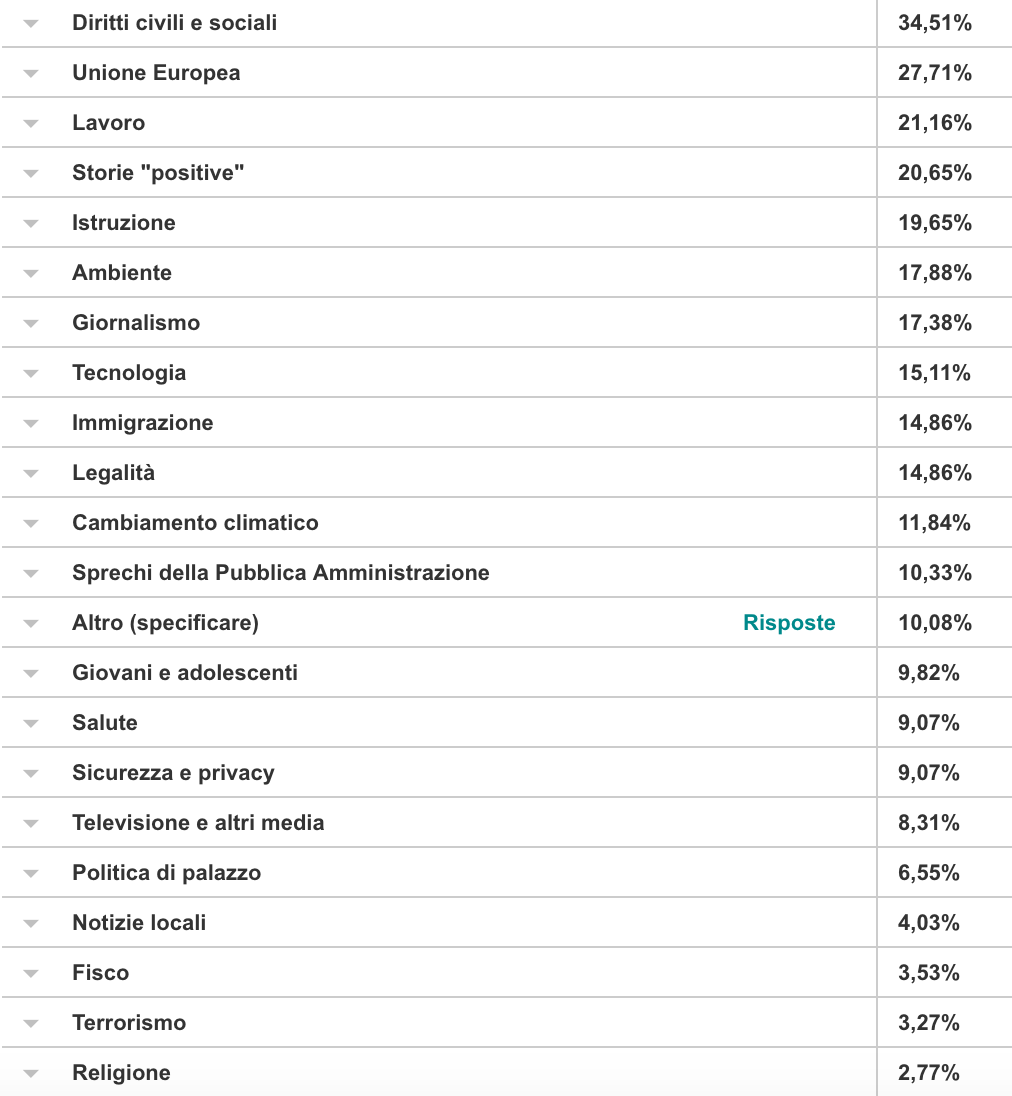 L’ordine completo delle risposte è disponibile nella tabella sottostante. Nella categoria "altro" sono stati indicati in particolare quattro aree tematiche: patrimonio culturale, governo del territorio e giustizia ambientale; cultura, ricerca e divulgazione scientifica; innovazione sociale, beni comuni e mobilità sostenibile; discriminazione delle donne e femminicidi. Alcune risposte hanno riguardato i format attraverso i quali fare informazione: c’è chi ha richiesto più quiz interattivi (è stato fatto proprio l’esempio del quiz trivelle realizzato da Valigia Blu in occasione del referendum trivelle) e più spazio a giornalismo fotografico e giornalismo visivo (racconti lunghi e multimediali).