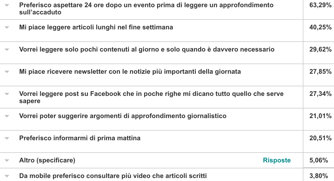 Per quanto riguardare le esigenze informative, si poteva indicare fino a un massimo di tre risposte tra alcune opzioni da noi indicate. Quasi 2 persone su 3 preferiscono aspettare 24 ore dopo un evento prima di leggere un approfondimento sull’accaduto; il 40% ama leggere articoli lunghi nel fine settimana; poco meno di un terzo vorrebbe leggere pochi contenuti al giorno e solo quando è davvero necessaria. Le risposte date suggeriscono che i partecipanti al questionario vanno alla ricerca informazioni chiare e approfondite. Indicazioni rafforzate da quanto indicato nella categoria "altro": confronto tra voci e fonti diverse, affidabilità delle fonti, notizie verificate.