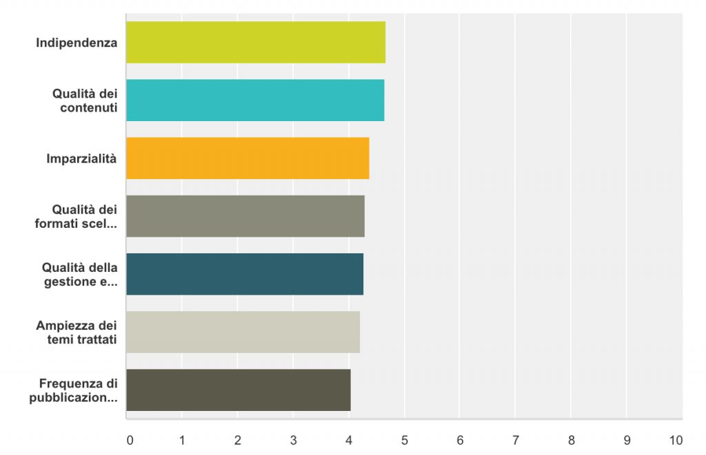 Nel complesso il lavoro di Valigia Blu è stato ritenuto quasi ottimo per indipendenza e qualità dei contenuti, buono per imparzialità, formati scelti per fare informazione, ampiezza dei temi trattati, la gestione e moderazione dei commenti e la frequenza delle pubblicazioni.