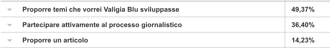 Poi abbiamo chiesto un passetto in più. Siccome guardiamo a chi frequenta il nostro sito e i nostri social network non come semplici lettori ma come parte attiva di una community, abbiamo chiesto ai partecipanti se volessero essere più coinvolti da Valigia Blu. Il 60% si è detto favorevole a un maggiore coinvolgimento. Di questi, quasi la metà vorrebbe che Valigia Blu sviluppasse temi da loro proposti, il 36% parteciperebbe attivamente al processo giornalistico, il 14% proporrebbe direttamente un articolo.