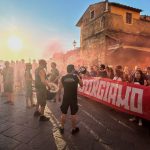 Alla fine dell’assemblea, dai piedi della Torre circa 250 tra lavoratori, solidal3 e cittadin3 improvvisano un corteo per le strade del centro di Firenze. Dietro lo striscione “La nostra rabbia tocca il cielo. Buste, reddito, reindustrializzazione”, sfilano accanto a centinaia di cittadin3 e turist3, per lo più stranier3, che affollano le viuzze del centro storico, nella prima estate dopo l’emergenza pandemica e incuriosit3 riprendono con il cellulare. Un corteo partito con la stanchezza di due anni di assemblea permanente — troppe le battute d’arresto, perché troppi i lavoratori costretti a licenziarsi per agganciare uno stipendio, per compensare vittorie solo parziali — ma che vede crescere l’entusiasmo e l’orgoglio dei partecipanti mentre attraversano Piazza Signoria e poi sfilano sul Ponte Vecchio, i fumogeni a incorniciare un tardo pomeriggio dorato, un drago colorato e fumante che dalla Torre gli operai vedono entrare di prepotenza nel panorama cittadino. Si sentono, ci sentiamo, di nuovo invincibil3.