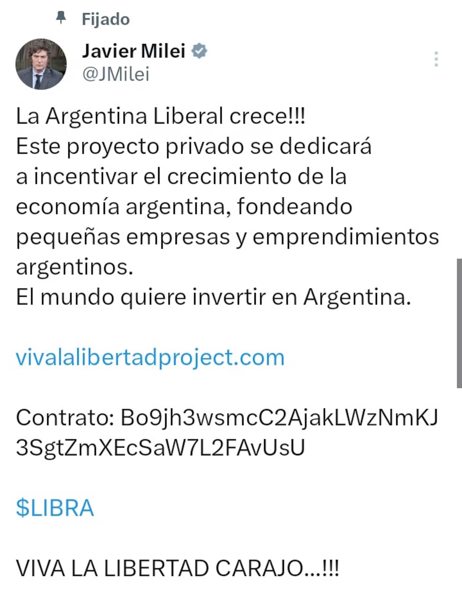 Venerdì 14 febbraio alle ore 19 in Argentina, Milei ha diffuso il lancio di $Libra. Nel post pubblicato sul suo account su X, che ha 3,5 milioni di follower, ha scritto: “Questo progetto privato si dedicherà a incentivare la crescita dell'economia argentina, finanziando piccole imprese e progetti imprenditoriali argentini. Il mondo vuole investire in Argentina”.