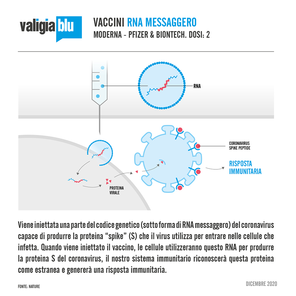 11 min letturaScommessa o scoperta rivoluzionaria? Da quando sono stati approvati i vaccini di Pfizer & BioNTech e di Moderna, grande attenzione è stata rivolta alla particolare tecnologia utilizzata per svilupparli: l’RNA messaggero (mRNA). A differenza dei vaccini più tradizionali che utilizzano una versione indebolita o morta di un virus o una proteina generata in laboratorio, queste tipologie di vaccino sfruttano una molecola che noi stessi usiamo, l’RNA messaggero, appunto. L’mRNA contiene l'informazione per produrre la proteina "spike" (S) che il virus utilizza per entrare nelle cellule che infetta. Quando viene iniettato il vaccino, le cellule utilizzeranno questo RNA per produrre la proteina S del coronavirus, il nostro sistema immunitario riconoscerà questa proteina come estranea e genererà una risposta immunitaria, come avverrebbe in caso di un'infezione "naturale".