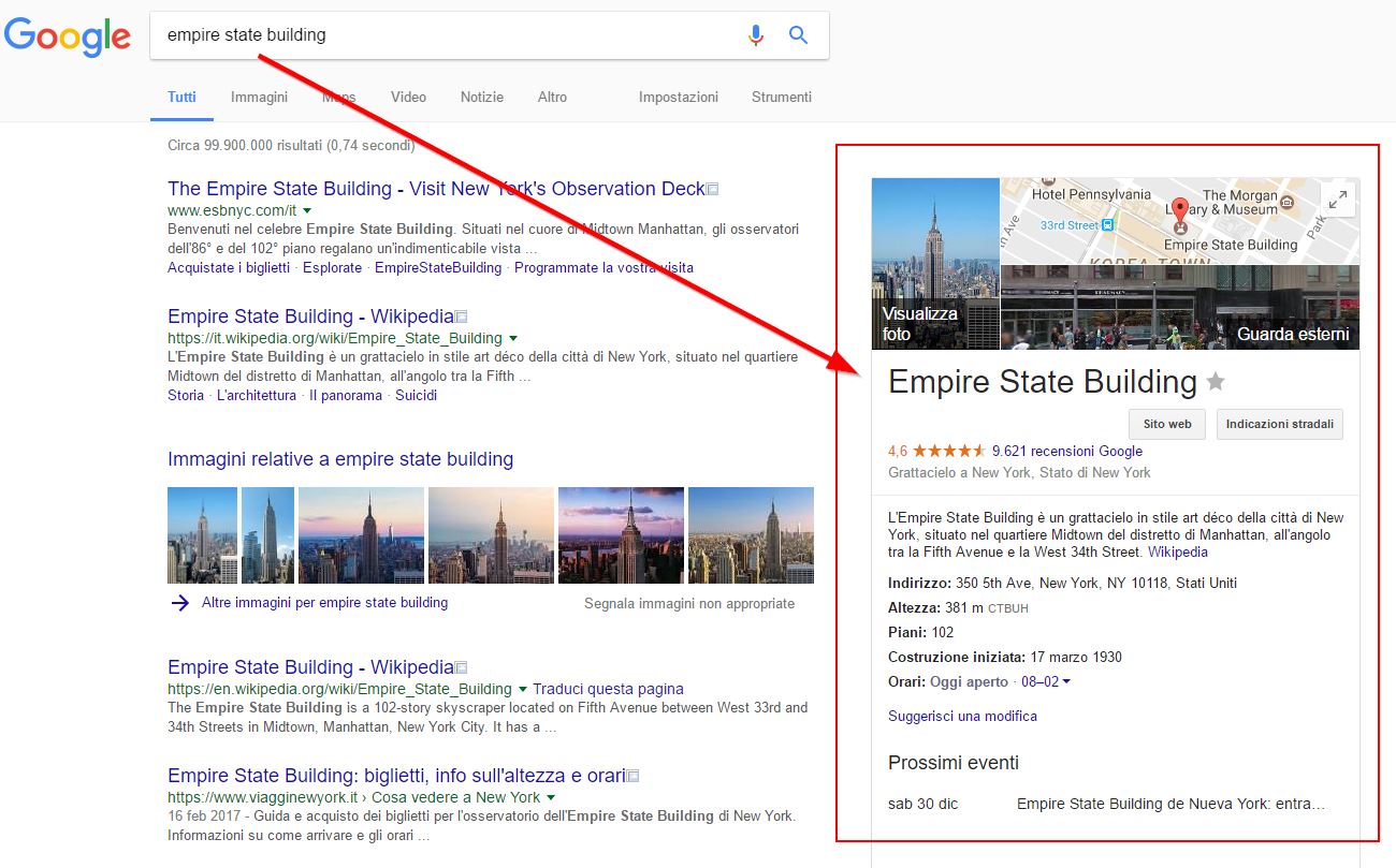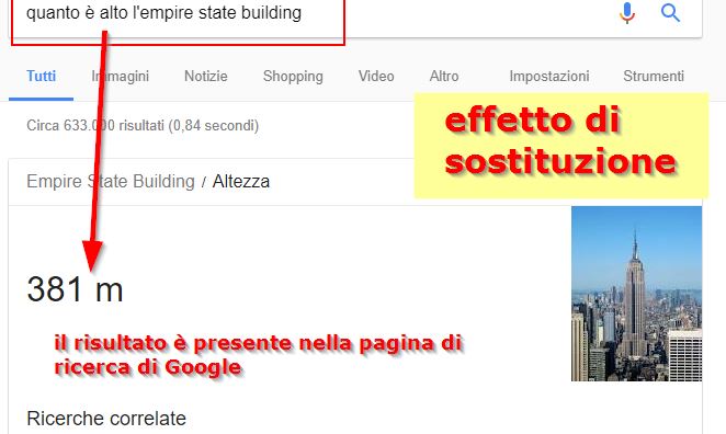 Infatti, oggi i motori di ricerca hanno realizzato una profonda integrazione verticale, proponendo una serie di informazioni direttamente all'utente. Ad esempio, se io cerco su Google “empire state building” (ma anche con Bing), ottengo una serie di informazioni ulteriori (come anche l’altezza dell’edificio), indicando eventualmente la loro fonte (es. Wikipedia).
