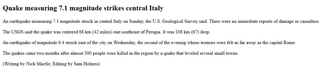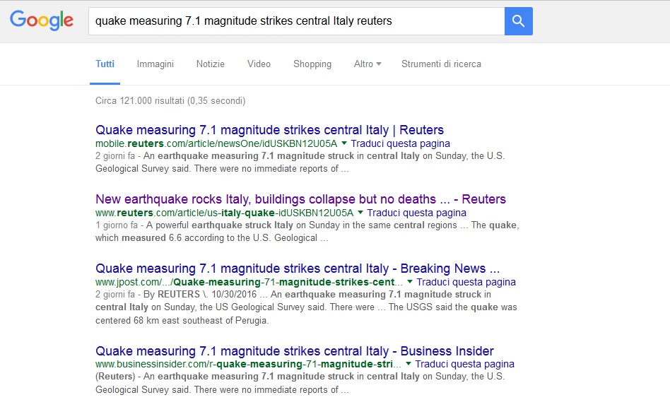 Peraltro la Reuters, dopo la pubblicazione, ha modificato completamente il testo senza dare conto dell'errore (come hanno fatto diversi altri media). Infatti, se si effettua una ricerca su Google con il testo del primo flash («Quake measuring 7.1 magnitude strikes central Italy»), si scopre che compare ancora nell'anteprima dei risultati (ripreso da altri media).