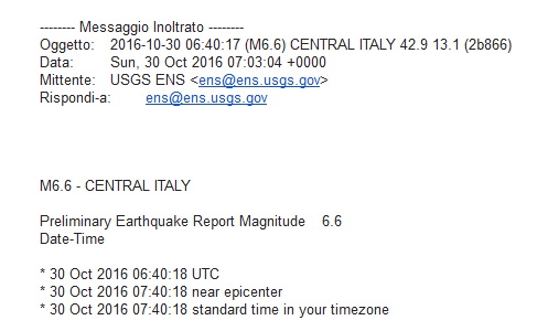 Di questo abbiamo avuto conferma anche da Carlo Meletti, responsabile del Centro di Pericolosità Sismica dell'INGV. Meletti riceve via mail i messaggi di allerta sui terremoti dallo USGS e la mattina del 30 ottobre non ha ricevuto nessun altro avviso, oltre a questo che ci ha inoltrato: