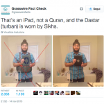 That’s an iPad, not a Quran, and the Dastar (turban) is worn by Sikhs. pic.twitter.com/xkKzJ0G65f — Grasswire Fact Check (@grasswirefacts) 14 Novembre 2015
