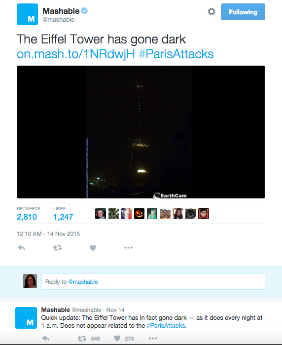 Questo esempio di Mashable dimostra che è possibile fare degli aggiornamenti live. ‘Rispondendo’ al loro tweet originale, era possibile mantenere la correzione collegata al tweet originale. Ma come spesso succede, la correzione è stata retwittata molte meno volte dell'originale informazione sbagliata (alle 12:40ET di lunedì 16 novembre, il tweet originale, sbagliato, aveva 2.816 RT, la correzione solo 550).In realtà, la falsa-notizia sulla Tour Eiffel è andata particolarmente fuori controllo quando @ProfJeffJarvis, account-parodia, ha twittato “Wow. Spente le luci alla Tour Eiffel per la prima volta dal 1889” (per prendere in giro tutti i tweet falsi sul simbolo francese). Eppure alla fine il tweet ha avuto circa 30.000 RT, incluso quello di una news organisation che lo ha ripreso come un fatto reale.