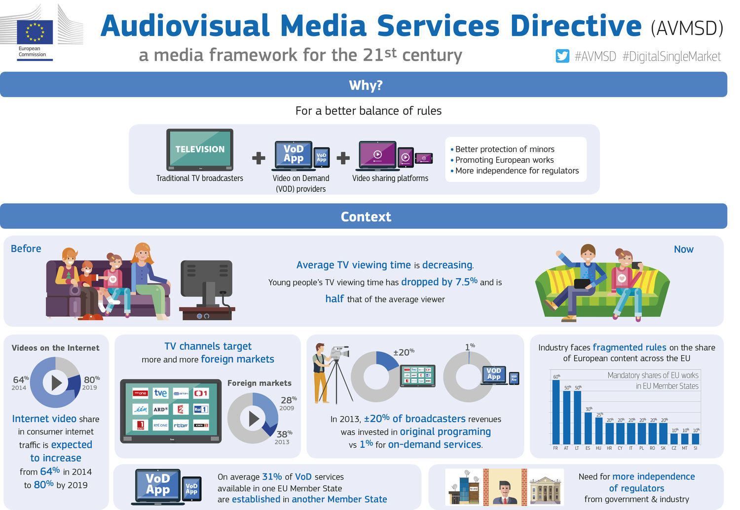 4 min letturaEra molto atteso il voto della Commissione CULT (cultura) del Parlamento dell'Unione europea sulla proposta di direttiva Audio Visual Media Services (AVMS), che si è tenuto il 25 aprile scorso. La direttiva, originariamente progettata per la Tv satellitare e per le piattaforme di video on demand, e quindi in relazione a soggetti che hanno un controllo editoriale su ciò che pubblicano, si occupa di disegnare le regole anche per le piattaforme di video-sharing e social media, quindi soggetti senza un controllo editoriale. Ciò avviene con definizioni generiche che rendono già difficile comprenderne l’ambito di applicazione e le scelte sottostanti. Ad esempio, si occupa della regolamentazione delle immagini in movimento, compreso le GIF quindi, non copre però le sezioni video complementari ai giornali o siti di notizie online, presentando ovvie contraddizioni.