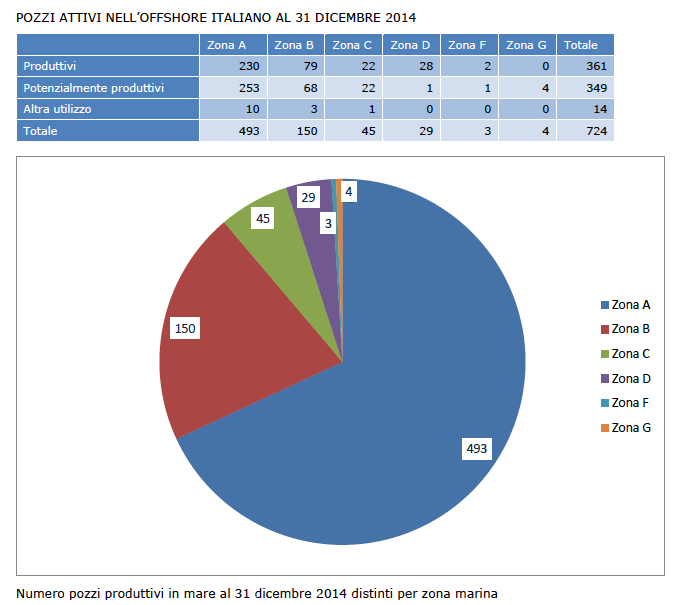 Nell’offshore italiano (cioè le piattaforme in mare) al 31 dicembre 2014 erano presenti 724 pozzi attivi dei quali 361 in produzione (305 produttivi a gas e 56 produttivi ad olio), 349 potenzialmente produttivi ma non eroganti e 14 utilizzati per monitoraggio e altri scopi. Di questi, 305 sono pozzi produttivi a gas e solo 56 a olio.