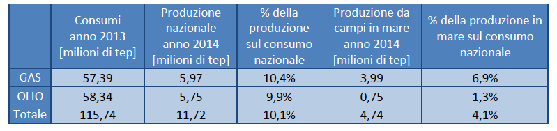 Nel 2014, la produzione di idrocarburi in Italia ha soddisfatto quasi il 10% del consumo totale nazionale. I nostri giacimenti hanno prodotto 7.286 milioni di metri cubi di gas (e di questi, 4.863 milioni, pari al 67%, in mare) e 5,75 milioni di tonnellate di petrolio (di cui solo 0,75 milioni in mare).