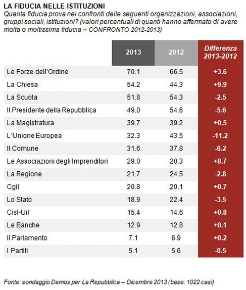 Tutti gli altri sono sotto il 50%. Il Presidente della Repubblica, per anni il più stimato e apprezzato esponente dell'intera classe politica, è in affanno (49.7%): il rapporto tra Napolitano e gli italiani è, di fatto, ai minimi storici. Il resto è ancora più disastroso: meno di quattro italiani su dieci si fidano della Magistratura, meno di uno su tre dell'Europa (-11% in un anno: la retorica anti-europeista ha funzionato fin troppo bene, e questo rischia di essere il grande tema delle prossime elezioni europee a fine maggio).