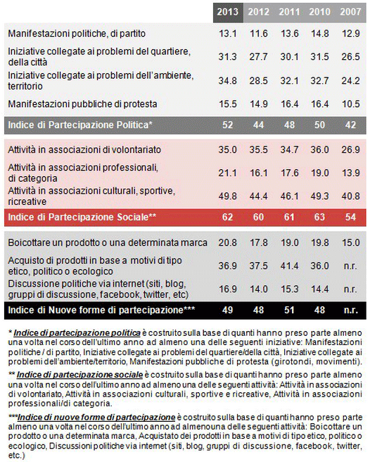 Gli indici di partecipazione politica, sociale e "nuova" (boicottaggi selettivi, consumo critico, attivismo digitale) non sono mai stati così alti negli ultimi sei anni. Il dato è certamente condizionato in positivo dalla presenza di due grandi appuntamenti elettorali (politiche e Primarie del PD), ma denota soprattutto una grande, inascoltata richiesta e un'altrettanto grande, inesplorata opportunità: gli italiani che non si arrendono alle tentazioni autoritaristiche chiedono solo di poter partecipare, hanno un capitale enorme di entusiasmo, civismo, determinazione.