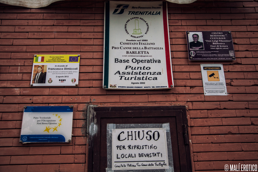 Il nostro percorso termina tra le rovine di Canne della Battaglia, teatro del trionfo di Annibale sulle armate imperiali romane. Quella di Canne è una delle cosiddette "stazioni impresenziate" che le ferrovie dello stato stanno affidando alla gestione dell'associazionismo locale. Ma davanti alle porte sbarrate troviamo il cartello "CHIUSO PER RIPRISTINO LOCALI DEVASTATI", lasciato dal "Comitato Italiano Pro Canne della Battaglia", titolare di un comodato d'uso fino al 2018 per l'utilizzo della stazione come base per le proprie attività di promozione turistica. Ma resta come spazio fruibile l'area bonificata dal Comitato attorno alla stazione, un piazzale e uno spazio verde dove troviamo chi gioca a pallone e chi allestisce cibo e bibite per i riti di pasquetta.