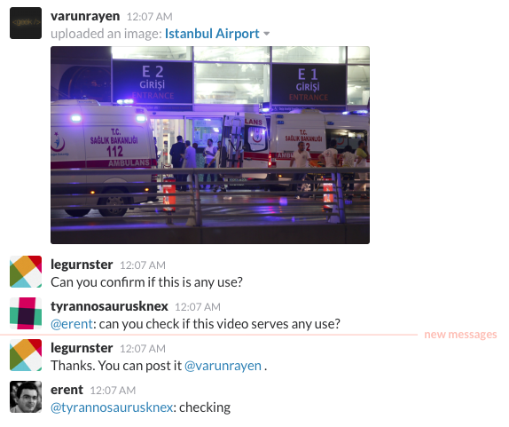 Lo scenario si capovolge il 28 giugno, quando alle 21:10 un attentato colpisce l'aeroporto internazionale Ataturk di Istanbul. È molto difficile avere subito il polso della situazione, non si capisce se ci sono stati scontri a fuoco o esplosioni, e in quale zona si sia verificato tutto ciò. Immediatamente su reddit viene aperto un canale live, "Explosions at Istanbul airport", aggiornato dagli stessi utenti con il materiale trovato in rete. Rapidamente le dimensioni del live feed - seguito di media da più di 15.000 utenti in contemporanea - fanno emergere la necessità di un lavoro più strutturato.