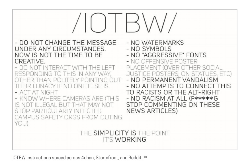• Viral Sloganeering. Riconfezionare messaggi politici o culturali divisivi sotto forma di brevi slogan – oscurandone le fonti – nel tentativo di influenzare le persone, forzare la copertura dei media e provocare risposte da parte delle istituzioni. Un esempio di questa strategia è stato l’uso dello slogan “It’s OK to be white”, ideato in contrapposizione al movimento Black Lives Matter per polarizzare l’attenzione dei media sulla questione delle politiche dell’identità bianca, creando così lo spazio per la diffusione di rappresentazioni razziste e suprematiste.