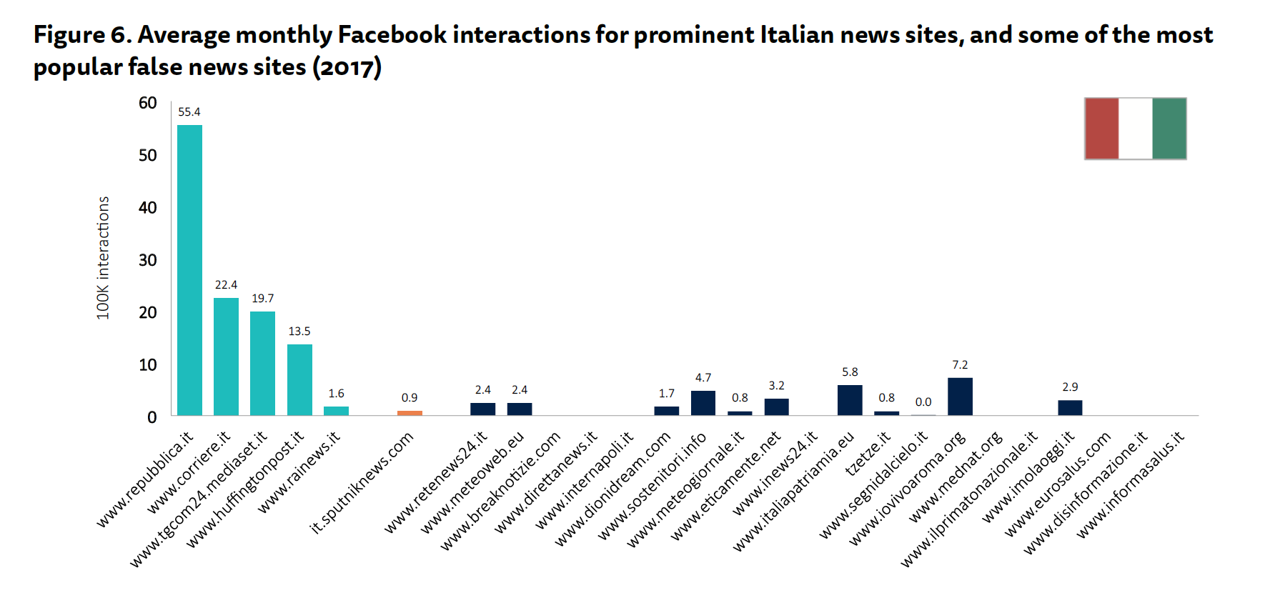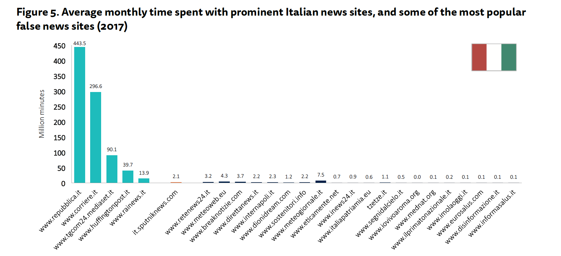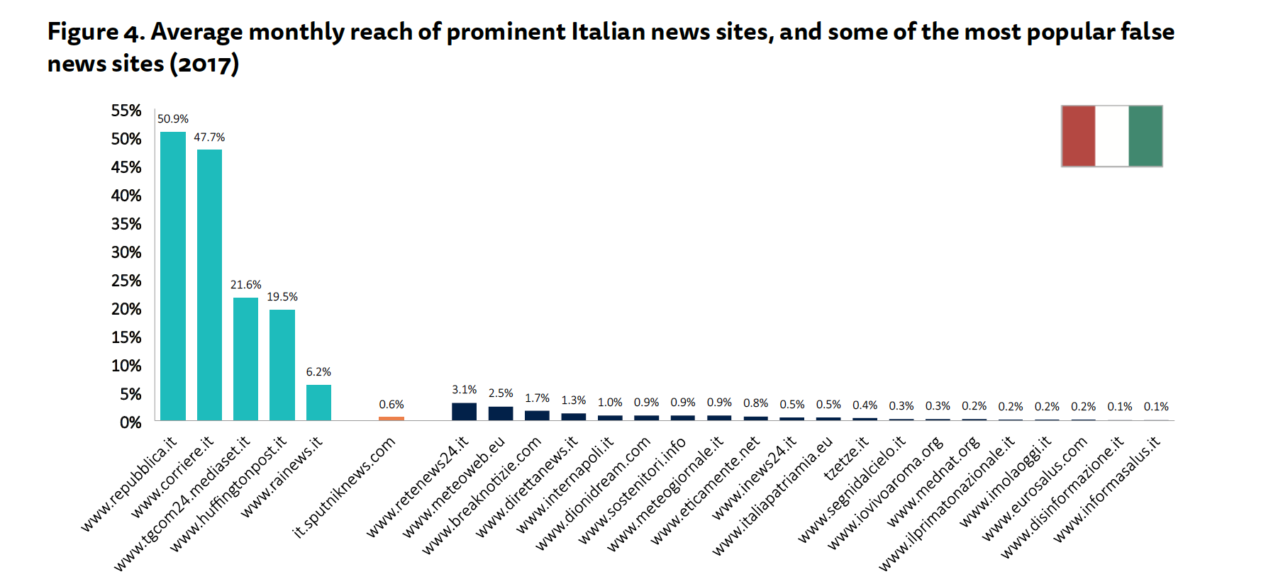 Il sito di notizie false più consultato è stato ReteNews 24, visitato in media ogni mese dal 3,1% della popolazione online italiana (poco più di 1 milione di persone). La maggior parte di questi siti non ha superato l'1% e anche il dato dell'edizione italiana di Sputnik News (raggiunto da appena lo 0,6% degli utenti) è stato molto basso. La Repubblica e Il Corriere della Sera sono i siti di gran lunga più consultati, raggiunti approssimativamente dal 50% della popolazione online. Un risultato nettamente superiore anche a quello delle principali testate francesi, che si avvicinano a malapena al 25% (risultato ottenuto da noi da TgCom24 e Huffington Post Italia).