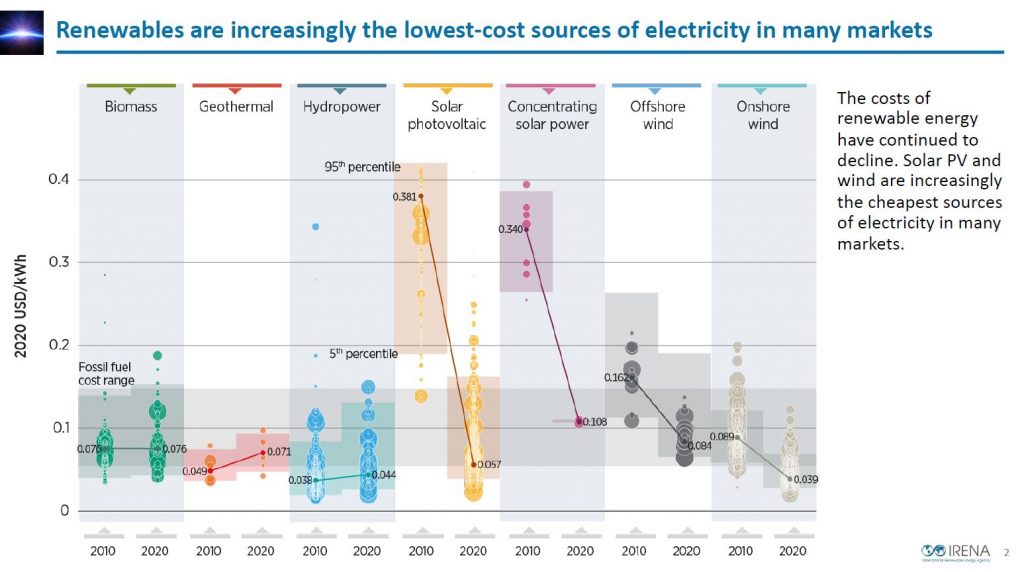 Ancora una volta, la convenienza nello sfruttare le rinnovabili è soprattutto economica: “i costi delle energie rinnovabili continuano a scendere. Il solare fotovoltaico e l’eolico sono, sempre di più, la fonte di elettricità più economica in molti mercati” (si legge a p. 41 del rapporto, figura 1.1).
