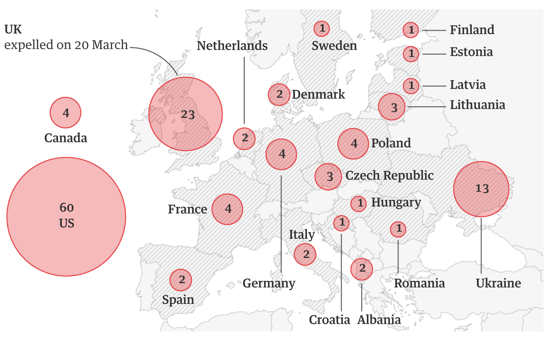 Lo stesso numero di diplomatici occidentali viene poi espulso dalla Russia pochi giorni dopo, come reazione.
