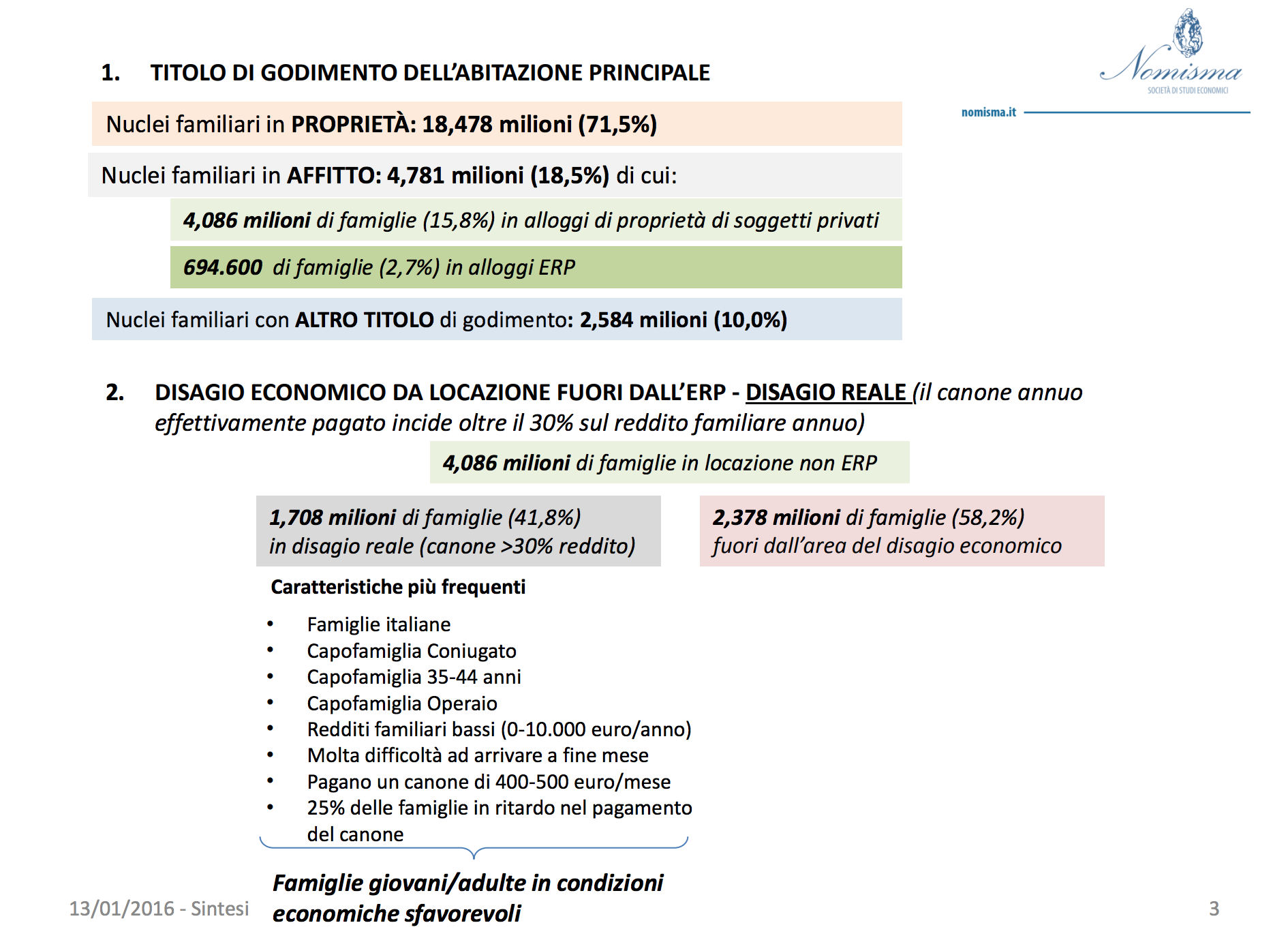 Nel loro complesso, le analisi statistiche a disposizione restituiscono un quadro che presenta, da un lato, una fascia importante di famiglie che vive in una situazione di disagio abitativo (come mostrato dal numero di persone che non riescono a sostenere i canoni di affitto e da quello degli sfratti, che seppure in calo rispetto agli anni precedenti, per il 90% sono dovuti a morosità incolpevole, cioè per incapacità a pagare l'affitto per diminuzione del proprio reddito) e, dall'altro, soluzioni inadeguate (basti pensare al numero delle case popolari, appena un terzo rispetto alle persone in disagio abitativo, alla presenza di circa 2,7 milioni di case vuote o in disuso perché in cattive condizioni o destinate a casa vacanze o seconda o terza casa). Negli anni scorsi il governo italiano ha creato un fondo immobiliare integrato (FIA) dedicato agli investimenti nell'edilizia popolare, la versione italiana del social housing, ma al momento questo fondo è poco utilizzato. Il FIA investe in fondi immobiliari locali per realizzare case a costi accessibili, destinate alle famiglie troppo ricche per avere diritto alle assegnazioni delle case popolari e troppo povere per accedere alle casa sul mercato immobiliare. Una formula che, però, scrive Rita Querzé sul Corriere della Sera, va registrata.