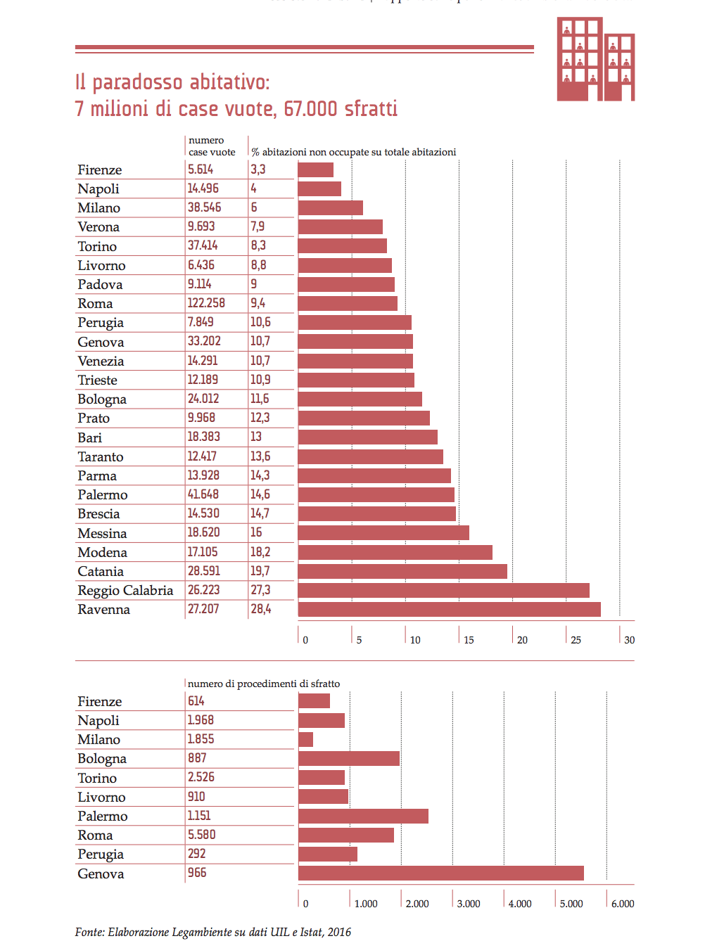 Secondo il rapporto di Legambiente "Ecosistema Urbano 2017", pubblicato lo scorso ottobre, il fenomeno delle case vuote ha proporzioni clamorose a Roma (dove ci sono oltre 120mila abitazioni non occupate), a Palermo (40mila case senza inquilini) e, in generale, nelle grandi città come Milano, Torino e Genova, dove ci sono in media tra i 30mila e i 40mila appartamenti deserti. Se si osservano i dati sulle case vuote in relazione al totale delle abitazioni presenti nei singoli Comuni la situazione in alcuni casi è sorprendente, come a Ravenna e Reggio Calabria, dove tra un quarto e un terzo delle abitazioni sono senza inquilini.