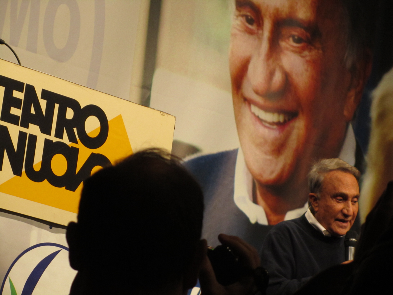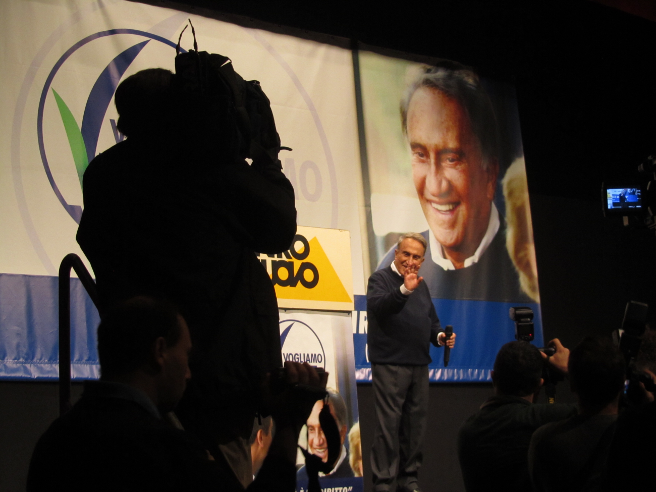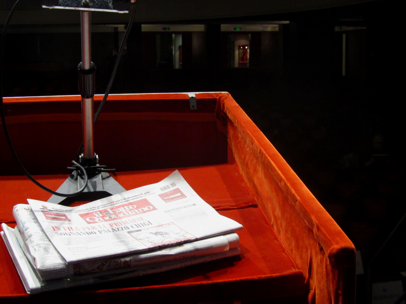 Mi guardo attorno alla ricerca della sala, scorgo il banchetto per gli accrediti stampa e le magliette e mi riprometto di non tornare a casa senza averne presa una, possibilmente taglia S. Punto verso la platea che mi accoglie col ripetersi ossessionante dell'inno della nuova formazione politica e un silenzio bisbigliato minacciato dai suoni delle riceventi della sicurezza e dai risolini dei giornalisti. «Allora, ti stai divertendo?», «Ammazza» - «Azzanni?», «Mannò, io mordo solo coi potenti. Questo...». È l'ora, ma non è ancora arrivato: mi accomodo appena dietro i posti riservati – ad alcuni dei quali è stato rimosso il cartello, e lasciato per terra – e segnalo la mia presenza qui e ora su Twitter.