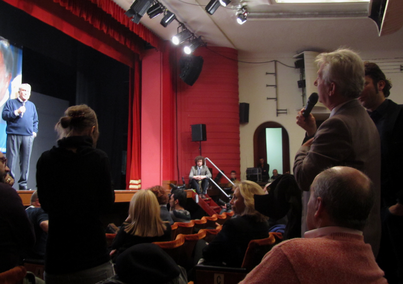 Questa foto è chiamata Gente che cerca risposte: per ben due volte il nostro unico rappresentante di popolo e piazza – che per convenzione chiameremo Il Gino - cercherà di intervenire, esprimendo tuttavia lo stesso concetto: non abbiamo idea di chi votare, per la prima volta, Emilio ti prego aiutaci. Il Gino si attarderà osservando un'intervista a sipario calato a due signore prese a giustificare il loro malcelato razzismo di fronte a una telecamera, ma non ho ben capito se lui - Gino - fosse ancora voce di pancia o team intervistante. La presenza scenica, la pronta loquela e la prossemica nel dopo-presentazione mi hanno indotto più di una volta a sospettare una messinscena, specie quando ha giustificato le poche presenze urlando a Fede un ostentato «l'evento non è stato pubblicizzato» abbastanza.