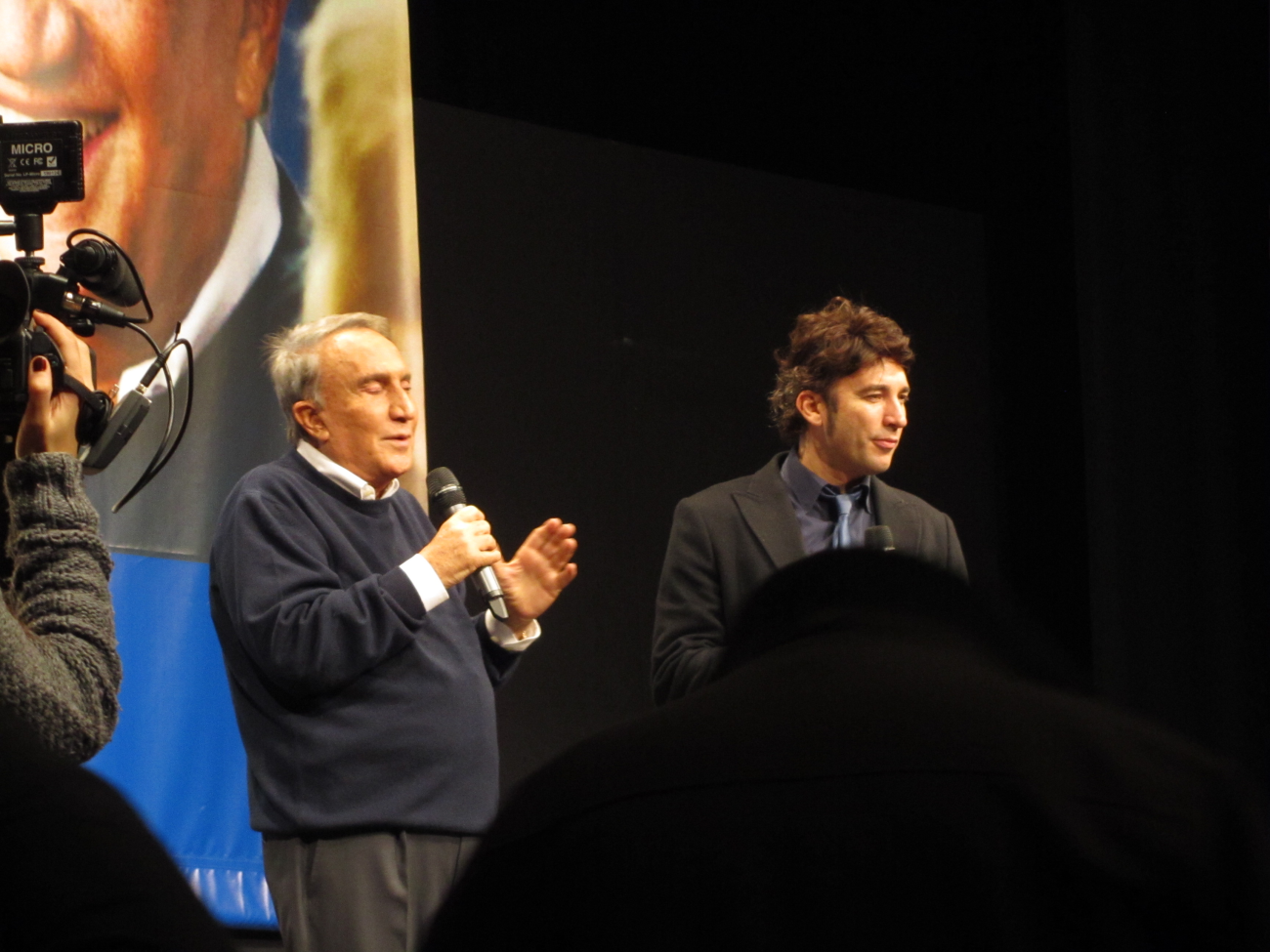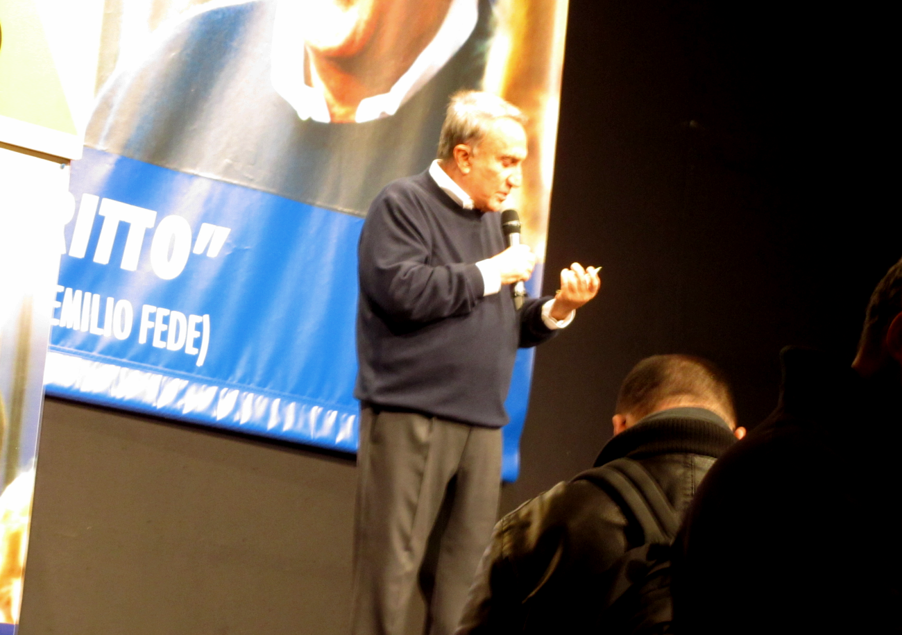 Non c'è l'atmosfera della 'ridotta', non ci sono superstiti di qualcosa: non c'è proprio nessuna atmosfera. Il Teatro Nuovo, nel centro di Milano, è lo scenario senza spettatori nel quale si dispiega la trama del Paese attraverso la storia della vita di Emilio Fede: come in Forrest Gump l'ex direttore del Tg4 ripercorre le tappe della sua carriera giornalistica, per ricordarci che in ogni momento, tragico e divertente, lui era lì sempre «dentro la notizia» a fare, come oggi, la prima pagina. Pienone o bluff, sintetizza Fede, sono le chiavi per i titoli forti. Mi guardo attorno per la prima volta, la platea sembra suggerire la seconda opzione: da destra, prime file, conto qualche testa d'anziano, un paio di giovani in fondo, soprattutto giornalisti e tecnici audiovisivi. Fede se ne accorge e ringrazia i colleghi accorsi, probabilmente gli unici a riempire i pochi posti occupati. Non è difficile leggere nei volti dei presenti la ragione della loro partecipazione: un paio di anziani incuriositi dalla possibilità di raccontare ai nipoti di averne visto uno famoso, una coppia di ragazzi dalla mimica facciale poco seria, due signore sui settanta, gravi nella loro militanza e bardate di pelo e amore di risulta per Silvio Berlusconi. La platea si arricchirà di qualche altro volto che comunque conosceremo in seguito.