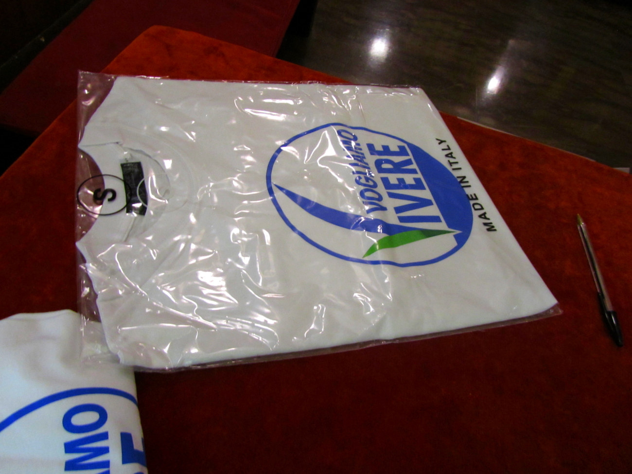 Menzione d'onore per la t-shirt ufficiale, rigorosamente made in Italy: mi viene consegnata da una ragazza di bella presenza estremamente cortese che neanche per un attimo ho osato immaginare assidua delle residenze berlusconiane. Mi sorride gentile, «Per te una S!»: è nelle mie mani. Ne do notizia in rete e mi disinnamoro di lei facendo le scale – è un mondo difficile.