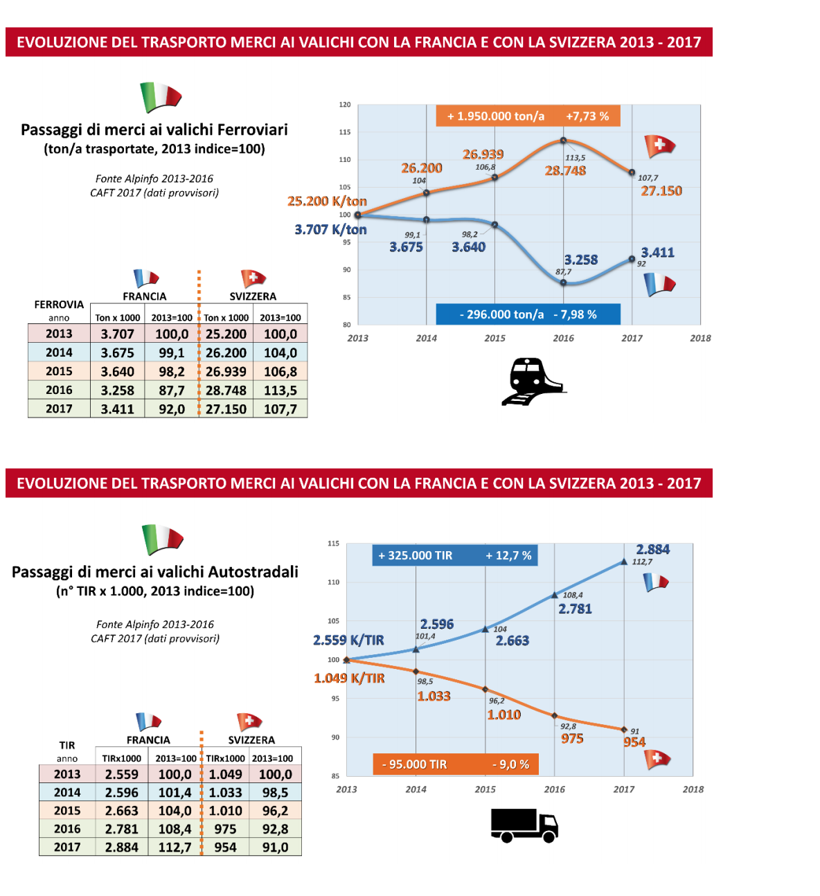 Rispetto al passato, i flussi di merci sono in linea con i dati degli ultimi anni e in leggero calo rispetto all’inizio del 2000, quando tra i due paesi erano circolate più di 50 milioni di tonnellate di merci. Il traffico ferroviario è calato negli ultimi 20 anni del 70%, passando dagli 11 milioni di tonnellate di merci del 1997 (il 23% del totale trasportato) ai 3,4 milioni di tonnellate del 2017 (pari al 7,7% del totale). Negli ultimi 4 anni c’è stato un calo di 300mila tonnellate di merci trasportate via treno.