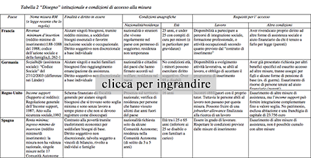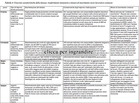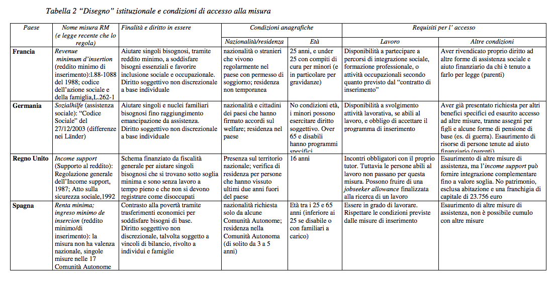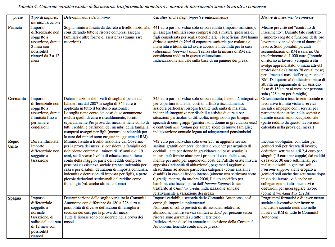 Tranne che in Italia e in Grecia, misure di legge di contrasto alla povertà sono presenti in tutta Europa. È del '92 la richiesta del Consiglio delle comunità europee per l'introduzione «in tutti gli Stati membri di un reddito minimo garantito, inteso quale fattore d'inserimento nella società dei cittadini più poveri». Negli anni,i Paesi europei si sono adeguati e hanno applicato politiche sociali indirizzate a tale scopo. Nel 2008, Gianluca Busilacchi, docente di sociologia dell’organizzazione all’Università di Macerata, ha analizzato in uno studio, comparandole, le misure di Rmg nell'Ue. Da quanto si legge le misure si differenziano per le condizioni di accesso e i requisiti richiesti, ma anche per la variazione della cifra concessa e la durata del beneficio, con l'aggiunta o meno di ulteriori diritti correlati – come ad esempio quello sanitario -. Riprendendo le tabelle presenti nello studio, è utile vedere come il Rmg funziona in quattro grandi Paesi come la Germania, la Francia, il Regno Unito e la Spagna. Riguardo ai dati, Busilacchi ci ha confermato che le misure presenti nei quattro Paesi presi in esame non hanno subito sostanziali cambiamenti. L’unico dato che abbiamo modificato, sotto la sua consulenza, per rapportarlo al 2013 è stato la cifra corrisposta da ogni Stato come beneficio.