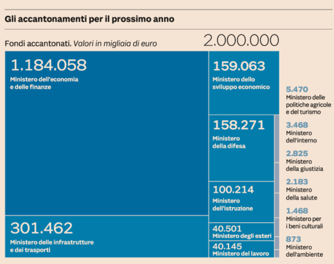 Gli “accantonamenti” di cui parla Fioramonti rappresentano le garanzie date a Bruxelles che hanno permesso di evitare le procedure d’infrazione, insieme alla clausole IVA rafforzate e al monitoraggio di alcuni obiettivi di finanza pubblica che avverrà tre momenti (con il DEF ad aprile 2019, una verifica apposita a luglio e la Nota di aggiornamento al DEF, a settembre), scrivono Marco Mobili e Marco Rogari sul Sole 24 Ore. “Il test determinante per scongelare i fondi dei ministeri sarà quello di luglio. Le risorse potranno essere sbloccate (...) solo se l'andamento tendenziale dei conti pubblici risulterà coerente con gli obiettivi fissati. In caso contrario almeno per il prossimo anno i fondi resteranno inutilizzabili”, concludono i due giornalisti.