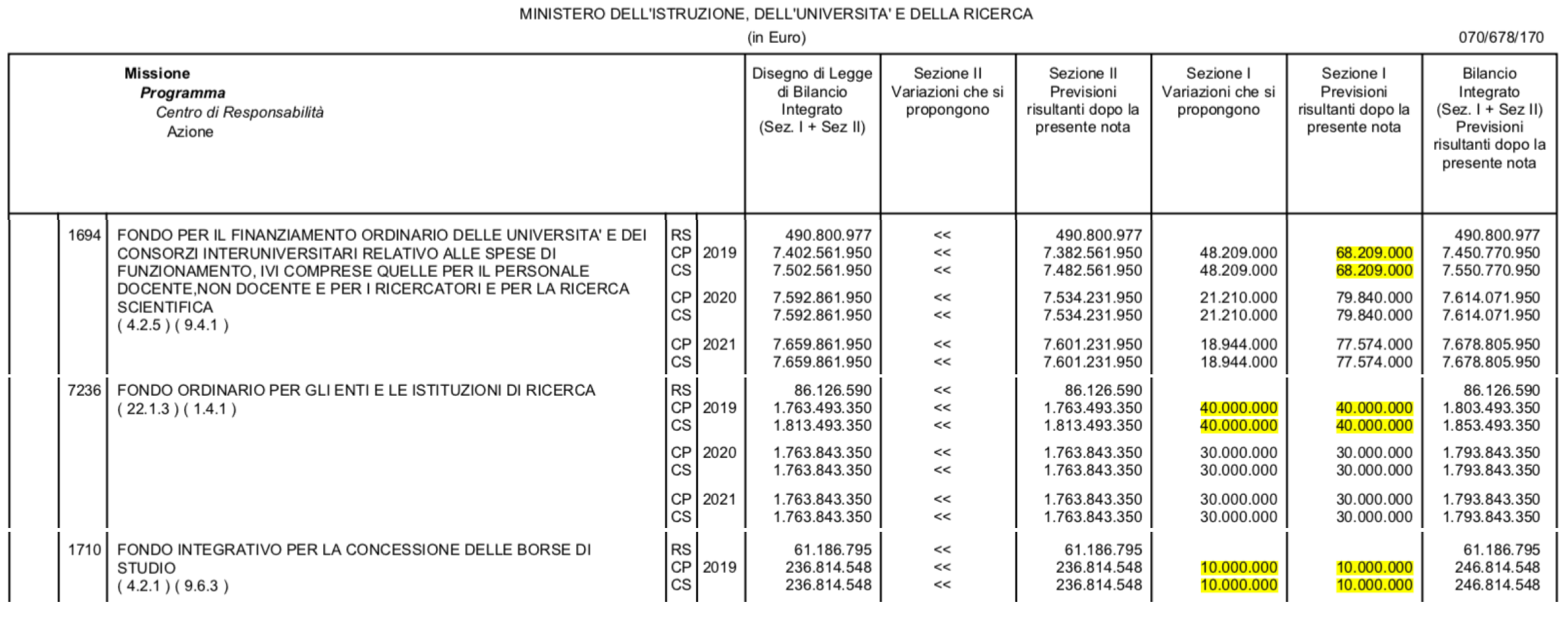 Riguardo l’Università e la Ricerca, in base alle ultime modifiche, la legge di bilancio (non ancora approvata) prevede: